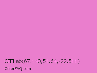 CIELab 67.143,51.64,-22.511 Color is a light magenta color and the nearest color is Persian Pink #f77fbe. Hex code #ea7ecd and RGB value is rgb(234,126,205). In RGB color space, this color is composed of 92% red, 49% green, 80% blue, In CMYK color space, this color is composed of 0% cyan, 46% magenta, 12% yellow , 8% black , In HSL color space, this color has a hue angle of 316° , 72% saturation and 71% lightness.