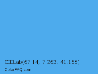 CIELab 67.14,-7.263,-41.165 Color is a light blue color and the nearest color is Picton Blue #45b1e8. Hex code #4dabed and RGB value is rgb(77,171,237). In RGB color space, this color is composed of 30% red, 67% green, 93% blue, In CMYK color space, this color is composed of 68% cyan, 28% magenta, 0% yellow , 7% black , In HSL color space, this color has a hue angle of 205° , 82% saturation and 62% lightness.