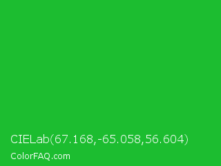 CIELab 67.168,-65.058,56.604 Color is a normal green color and the nearest color is Wageningen Green #34b233. Hex code #1cbd30 and RGB value is rgb(28,189,48). In RGB color space, this color is composed of 11% red, 74% green, 19% blue, In CMYK color space, this color is composed of 85% cyan, 0% magenta, 75% yellow , 26% black , In HSL color space, this color has a hue angle of 127° , 74% saturation and 43% lightness.