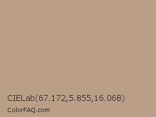 CIELab 67.172,5.855,16.068 Color is a light orange color and the nearest color is Mongoose #b5a27f. Hex code #b99f87 and RGB value is rgb(185,159,135). In RGB color space, this color is composed of 73% red, 62% green, 53% blue, In CMYK color space, this color is composed of 0% cyan, 14% magenta, 27% yellow , 27% black , In HSL color space, this color has a hue angle of 29° , 26% saturation and 63% lightness.