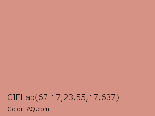 CIELab 67.17,23.55,17.637 Color is a light red color and the nearest color is My Pink #d69188. Hex code #d69385 and RGB value is rgb(214,147,133). In RGB color space, this color is composed of 84% red, 58% green, 52% blue, In CMYK color space, this color is composed of 0% cyan, 31% magenta, 38% yellow , 16% black , In HSL color space, this color has a hue angle of 10° , 50% saturation and 68% lightness.