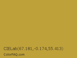 CIELab 67.181,-0.174,55.413 Color is a normal yellow color and the nearest color is Satin Sheen Gold #cba135. Hex code #bfa13a and RGB value is rgb(191,161,58). In RGB color space, this color is composed of 75% red, 63% green, 23% blue, In CMYK color space, this color is composed of 0% cyan, 16% magenta, 70% yellow , 25% black , In HSL color space, this color has a hue angle of 46° , 53% saturation and 49% lightness.