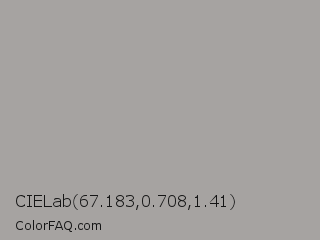 CIELab 67.183,0.708,1.41 Color is a light orange color and the nearest color is Delta #a4a49d. Hex code #a6a3a1 and RGB value is rgb(166,163,161). In RGB color space, this color is composed of 65% red, 64% green, 63% blue, In CMYK color space, this color is composed of 0% cyan, 2% magenta, 3% yellow , 35% black , In HSL color space, this color has a hue angle of 24° , 3% saturation and 64% lightness.