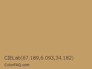 CIELab 67.189,6.093,34.182 Color is a normal orange color and the nearest color is Desert Camel #c19a6b. Hex code #c29e66 and RGB value is rgb(194,158,102). In RGB color space, this color is composed of 76% red, 62% green, 40% blue, In CMYK color space, this color is composed of 0% cyan, 19% magenta, 47% yellow , 24% black , In HSL color space, this color has a hue angle of 37° , 43% saturation and 58% lightness.