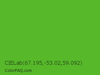 CIELab 67.195,-53.02,59.092 Color is a normal green color and the nearest color is Green RYB #66b032. Hex code #57b92a and RGB value is rgb(87,185,42). In RGB color space, this color is composed of 34% red, 73% green, 16% blue, In CMYK color space, this color is composed of 53% cyan, 0% magenta, 77% yellow , 27% black , In HSL color space, this color has a hue angle of 101° , 63% saturation and 45% lightness.