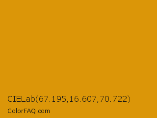 CIELab 67.195,16.607,70.722 Color is a normal orange color and the nearest color is Harvest Gold #da9100. Hex code #db9608 and RGB value is rgb(219,150,8). In RGB color space, this color is composed of 86% red, 59% green, 3% blue, In CMYK color space, this color is composed of 0% cyan, 32% magenta, 96% yellow , 14% black , In HSL color space, this color has a hue angle of 40° , 93% saturation and 45% lightness.