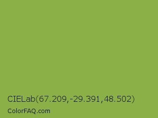 CIELab 67.209,-29.391,48.502 Color is a normal green color and the nearest color is Sushi #87ab39. Hex code #8ab047 and RGB value is rgb(138,176,71). In RGB color space, this color is composed of 54% red, 69% green, 28% blue, In CMYK color space, this color is composed of 22% cyan, 0% magenta, 60% yellow , 31% black , In HSL color space, this color has a hue angle of 82° , 43% saturation and 48% lightness.