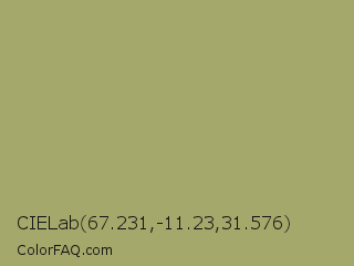 CIELab 67.231,-11.23,31.576 Color is a normal yellow color and the nearest color is Green Smoke #a4af6e. Hex code #a4a86a and RGB value is rgb(164,168,106). In RGB color space, this color is composed of 64% red, 66% green, 42% blue, In CMYK color space, this color is composed of 2% cyan, 0% magenta, 37% yellow , 34% black , In HSL color space, this color has a hue angle of 64° , 26% saturation and 54% lightness.