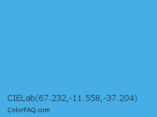 CIELab 67.232,-11.558,-37.204 Color is a normal blue color and the nearest color is Picton Blue #45b1e8. Hex code #47ade6 and RGB value is rgb(71,173,230). In RGB color space, this color is composed of 28% red, 68% green, 90% blue, In CMYK color space, this color is composed of 69% cyan, 25% magenta, 0% yellow , 10% black , In HSL color space, this color has a hue angle of 202° , 76% saturation and 59% lightness.