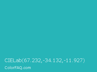 CIELab 67.232,-34.132,-11.927 Color is a normal cyan color and the nearest color is Maximum Blue Green #30bfbf. Hex code #27b5b8 and RGB value is rgb(39,181,184). In RGB color space, this color is composed of 15% red, 71% green, 72% blue, In CMYK color space, this color is composed of 79% cyan, 2% magenta, 0% yellow , 28% black , In HSL color space, this color has a hue angle of 181° , 65% saturation and 44% lightness.