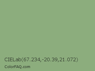 CIELab 67.234,-20.39,21.072 Color is a normal green color and the nearest color is Asparagus #87a96b. Hex code #8cad7d and RGB value is rgb(140,173,125). In RGB color space, this color is composed of 55% red, 68% green, 49% blue, In CMYK color space, this color is composed of 19% cyan, 0% magenta, 28% yellow , 32% black , In HSL color space, this color has a hue angle of 101° , 23% saturation and 58% lightness.