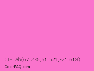 CIELab 67.236,61.521,-21.618 Color is a light magenta color and the nearest color is Rose Pink #ff66cc. Hex code #fa73cc and RGB value is rgb(250,115,204). In RGB color space, this color is composed of 98% red, 45% green, 80% blue, In CMYK color space, this color is composed of 0% cyan, 54% magenta, 18% yellow , 2% black , In HSL color space, this color has a hue angle of 320° , 93% saturation and 72% lightness.