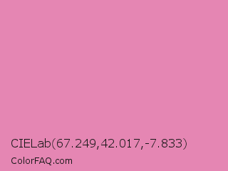 CIELab 67.249,42.017,-7.833 Color is a light rose color and the nearest color is Light Thulian Pink #e68fac. Hex code #e586b3 and RGB value is rgb(229,134,179). In RGB color space, this color is composed of 90% red, 53% green, 70% blue, In CMYK color space, this color is composed of 0% cyan, 41% magenta, 22% yellow , 10% black , In HSL color space, this color has a hue angle of 332° , 65% saturation and 71% lightness.