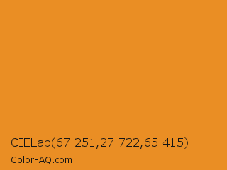 CIELab 67.251,27.722,65.415 Color is a normal orange color and the nearest color is Carrot Orange #ed9121. Hex code #ea8e24 and RGB value is rgb(234,142,36). In RGB color space, this color is composed of 92% red, 56% green, 14% blue, In CMYK color space, this color is composed of 0% cyan, 39% magenta, 85% yellow , 8% black , In HSL color space, this color has a hue angle of 32° , 83% saturation and 53% lightness.
