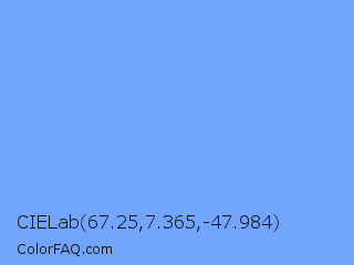 CIELab 67.25,7.365,-47.984 Color is a light blue color and the nearest color is French Sky Blue #77b5fe. Hex code #71a4fa and RGB value is rgb(113,164,250). In RGB color space, this color is composed of 44% red, 64% green, 98% blue, In CMYK color space, this color is composed of 55% cyan, 34% magenta, 0% yellow , 2% black , In HSL color space, this color has a hue angle of 218° , 93% saturation and 71% lightness.