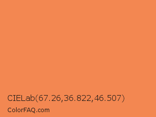 CIELab 67.26,36.822,46.507 Color is a light orange color and the nearest color is Coral #ff7f50. Hex code #f38751 and RGB value is rgb(243,135,81). In RGB color space, this color is composed of 95% red, 53% green, 32% blue, In CMYK color space, this color is composed of 0% cyan, 44% magenta, 67% yellow , 5% black , In HSL color space, this color has a hue angle of 20° , 87% saturation and 64% lightness.