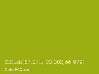 CIELab 67.271,-23.302,66.979 Color is a normal yellow color and the nearest color is Citron #9fa91f. Hex code #9cad10 and RGB value is rgb(156,173,16). In RGB color space, this color is composed of 61% red, 68% green, 6% blue, In CMYK color space, this color is composed of 10% cyan, 0% magenta, 91% yellow , 32% black , In HSL color space, this color has a hue angle of 66° , 83% saturation and 37% lightness.