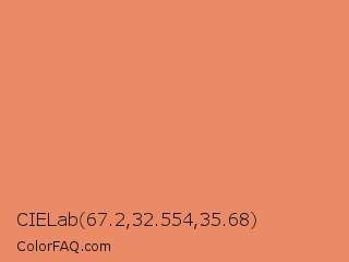 CIELab 67.2,32.554,35.68 Color is a light orange color and the nearest color is Big Foot Feet #e88e5a. Hex code #ea8b65 and RGB value is rgb(234,139,101). In RGB color space, this color is composed of 92% red, 55% green, 40% blue, In CMYK color space, this color is composed of 0% cyan, 41% magenta, 57% yellow , 8% black , In HSL color space, this color has a hue angle of 17° , 76% saturation and 66% lightness.