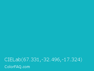 CIELab 67.331,-32.496,-17.324 Color is a normal cyan color and the nearest color is Tiffany Blue #0abab5. Hex code #12b5c2 and RGB value is rgb(18,181,194). In RGB color space, this color is composed of 7% red, 71% green, 76% blue, In CMYK color space, this color is composed of 91% cyan, 7% magenta, 0% yellow , 24% black , In HSL color space, this color has a hue angle of 184° , 83% saturation and 42% lightness.