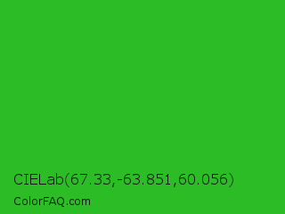 CIELab 67.33,-63.851,60.056 Color is a normal green color and the nearest color is Wageningen Green #34b233. Hex code #2cbd26 and RGB value is rgb(44,189,38). In RGB color space, this color is composed of 17% red, 74% green, 15% blue, In CMYK color space, this color is composed of 77% cyan, 0% magenta, 80% yellow , 26% black , In HSL color space, this color has a hue angle of 118° , 67% saturation and 45% lightness.
