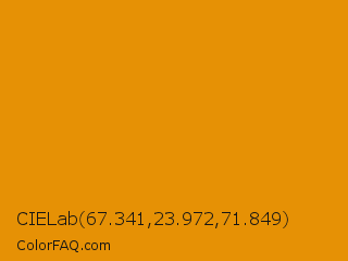 CIELab 67.341,23.972,71.849 Color is a normal orange color and the nearest color is Harvest Gold #da9100. Hex code #e69105 and RGB value is rgb(230,145,5). In RGB color space, this color is composed of 90% red, 57% green, 2% blue, In CMYK color space, this color is composed of 0% cyan, 37% magenta, 98% yellow , 10% black , In HSL color space, this color has a hue angle of 37° , 96% saturation and 46% lightness.