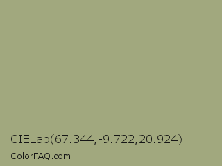 CIELab 67.344,-9.722,20.924 Color is a normal yellow color and the nearest color is Sage #9ea587. Hex code #a1a87e and RGB value is rgb(161,168,126). In RGB color space, this color is composed of 63% red, 66% green, 49% blue, In CMYK color space, this color is composed of 4% cyan, 0% magenta, 25% yellow , 34% black , In HSL color space, this color has a hue angle of 70° , 19% saturation and 58% lightness.