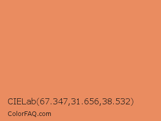 CIELab 67.347,31.656,38.532 Color is a light orange color and the nearest color is Big Foot Feet #e88e5a. Hex code #ea8c60 and RGB value is rgb(234,140,96). In RGB color space, this color is composed of 92% red, 55% green, 38% blue, In CMYK color space, this color is composed of 0% cyan, 40% magenta, 59% yellow , 8% black , In HSL color space, this color has a hue angle of 19° , 77% saturation and 65% lightness.