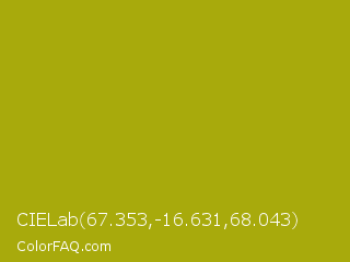 CIELab 67.353,-16.631,68.043 Color is a normal yellow color and the nearest color is Sahara #b7a214. Hex code #a8aa0c and RGB value is rgb(168,170,12). In RGB color space, this color is composed of 66% red, 67% green, 5% blue, In CMYK color space, this color is composed of 1% cyan, 0% magenta, 93% yellow , 33% black , In HSL color space, this color has a hue angle of 61° , 87% saturation and 36% lightness.