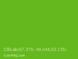 CIELab 67.379,-49.044,63.135 Color is a normal green color and the nearest color is Lima #76bd17. Hex code #65b81d and RGB value is rgb(101,184,29). In RGB color space, this color is composed of 40% red, 72% green, 11% blue, In CMYK color space, this color is composed of 45% cyan, 0% magenta, 84% yellow , 28% black , In HSL color space, this color has a hue angle of 92° , 73% saturation and 42% lightness.