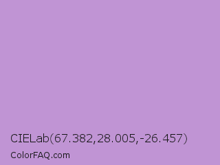 CIELab 67.382,28.005,-26.457 Color is a light purple color and the nearest color is Light Grayish Magenta #cc99cc. Hex code #c094d4 and RGB value is rgb(192,148,212). In RGB color space, this color is composed of 75% red, 58% green, 83% blue, In CMYK color space, this color is composed of 9% cyan, 30% magenta, 0% yellow , 17% black , In HSL color space, this color has a hue angle of 281° , 43% saturation and 71% lightness.
