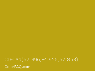 CIELab 67.396,-4.956,67.853 Color is a normal yellow color and the nearest color is Sahara #b7a214. Hex code #bba412 and RGB value is rgb(187,164,18). In RGB color space, this color is composed of 73% red, 64% green, 7% blue, In CMYK color space, this color is composed of 0% cyan, 12% magenta, 90% yellow , 27% black , In HSL color space, this color has a hue angle of 52° , 82% saturation and 40% lightness.
