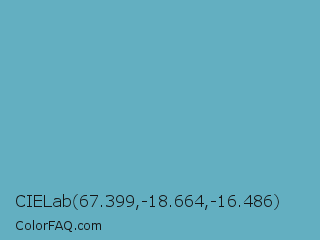 CIELab 67.399,-18.664,-16.486 Color is a normal cyan color and the nearest color is Fountain Blue #56b4be. Hex code #63afc1 and RGB value is rgb(99,175,193). In RGB color space, this color is composed of 39% red, 69% green, 76% blue, In CMYK color space, this color is composed of 49% cyan, 9% magenta, 0% yellow , 24% black , In HSL color space, this color has a hue angle of 191° , 43% saturation and 57% lightness.