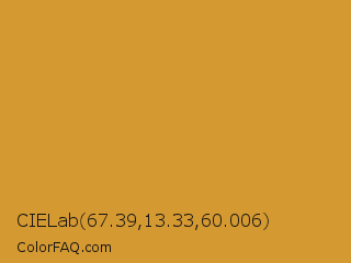 CIELab 67.39,13.33,60.006 Color is a normal orange color and the nearest color is Satin Sheen Gold #cba135. Hex code #d59931 and RGB value is rgb(213,153,49). In RGB color space, this color is composed of 84% red, 60% green, 19% blue, In CMYK color space, this color is composed of 0% cyan, 28% magenta, 77% yellow , 16% black , In HSL color space, this color has a hue angle of 38° , 66% saturation and 51% lightness.