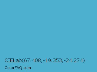 CIELab 67.408,-19.353,-24.274 Color is a normal blue color and the nearest color is Shakespeare #4eabd1. Hex code #4eb0cf and RGB value is rgb(78,176,207). In RGB color space, this color is composed of 31% red, 69% green, 81% blue, In CMYK color space, this color is composed of 62% cyan, 15% magenta, 0% yellow , 19% black , In HSL color space, this color has a hue angle of 194° , 57% saturation and 56% lightness.