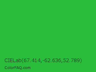CIELab 67.414,-62.636,52.789 Color is a normal green color and the nearest color is Wageningen Green #34b233. Hex code #29bd3b and RGB value is rgb(41,189,59). In RGB color space, this color is composed of 16% red, 74% green, 23% blue, In CMYK color space, this color is composed of 78% cyan, 0% magenta, 69% yellow , 26% black , In HSL color space, this color has a hue angle of 127° , 64% saturation and 45% lightness.