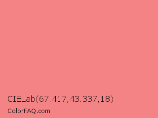 CIELab 67.417,43.337,18 Color is a light red color and the nearest color is Light Coral #f08080. Hex code #f48386 and RGB value is rgb(244,131,134). In RGB color space, this color is composed of 96% red, 51% green, 53% blue, In CMYK color space, this color is composed of 0% cyan, 46% magenta, 45% yellow , 4% black , In HSL color space, this color has a hue angle of 358° , 84% saturation and 74% lightness.