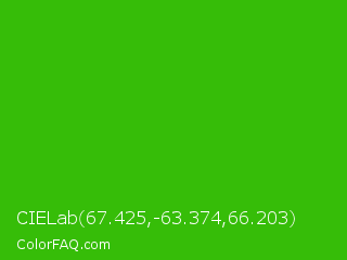 CIELab 67.425,-63.374,66.203 Color is a normal green color and the nearest color is Harlequin Green #46cb18. Hex code #36bd08 and RGB value is rgb(54,189,8). In RGB color space, this color is composed of 21% red, 74% green, 3% blue, In CMYK color space, this color is composed of 71% cyan, 0% magenta, 96% yellow , 26% black , In HSL color space, this color has a hue angle of 105° , 92% saturation and 39% lightness.