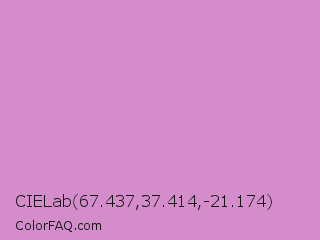 CIELab 67.437,37.414,-21.174 Color is a light magenta color and the nearest color is Light Medium Orchid #d39bcb. Hex code #d58ccb and RGB value is rgb(213,140,203). In RGB color space, this color is composed of 84% red, 55% green, 80% blue, In CMYK color space, this color is composed of 0% cyan, 34% magenta, 5% yellow , 16% black , In HSL color space, this color has a hue angle of 308° , 46% saturation and 69% lightness.