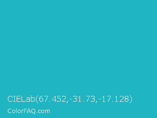 CIELab 67.452,-31.73,-17.128 Color is a normal cyan color and the nearest color is Java #1fc2c2. Hex code #1fb5c2 and RGB value is rgb(31,181,194). In RGB color space, this color is composed of 12% red, 71% green, 76% blue, In CMYK color space, this color is composed of 84% cyan, 7% magenta, 0% yellow , 24% black , In HSL color space, this color has a hue angle of 185° , 72% saturation and 44% lightness.