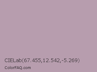 CIELab 67.455,12.542,-5.269 Color is a light magenta color and the nearest color is Pastel Purple #b39eb5. Hex code #b79dae and RGB value is rgb(183,157,174). In RGB color space, this color is composed of 72% red, 62% green, 68% blue, In CMYK color space, this color is composed of 0% cyan, 14% magenta, 5% yellow , 28% black , In HSL color space, this color has a hue angle of 321° , 15% saturation and 67% lightness.