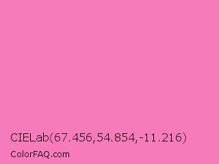 CIELab 67.456,54.854,-11.216 Color is a light rose color and the nearest color is Persian Pink #f77fbe. Hex code #f77aba and RGB value is rgb(247,122,186). In RGB color space, this color is composed of 97% red, 48% green, 73% blue, In CMYK color space, this color is composed of 0% cyan, 51% magenta, 25% yellow , 3% black , In HSL color space, this color has a hue angle of 329° , 89% saturation and 72% lightness.