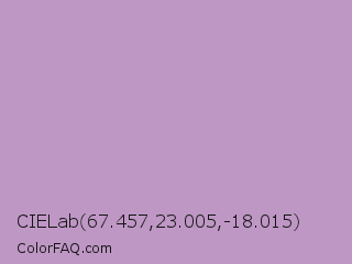 CIELab 67.457,23.005,-18.015 Color is a light magenta color and the nearest color is Pastel Violet #cb99c9. Hex code #bf97c5 and RGB value is rgb(191,151,197). In RGB color space, this color is composed of 75% red, 59% green, 77% blue, In CMYK color space, this color is composed of 3% cyan, 23% magenta, 0% yellow , 23% black , In HSL color space, this color has a hue angle of 292° , 28% saturation and 68% lightness.