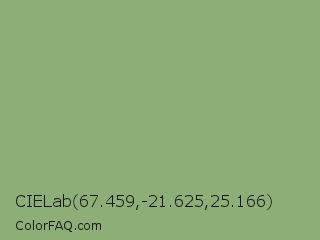 CIELab 67.459,-21.625,25.166 Color is a normal green color and the nearest color is Asparagus #87a96b. Hex code #8dae76 and RGB value is rgb(141,174,118). In RGB color space, this color is composed of 55% red, 68% green, 46% blue, In CMYK color space, this color is composed of 19% cyan, 0% magenta, 32% yellow , 32% black , In HSL color space, this color has a hue angle of 95° , 26% saturation and 57% lightness.