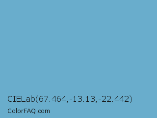 CIELab 67.464,-13.13,-22.442 Color is a light blue color and the nearest color is Iceberg #71a6d2. Hex code #69adcc and RGB value is rgb(105,173,204). In RGB color space, this color is composed of 41% red, 68% green, 80% blue, In CMYK color space, this color is composed of 49% cyan, 15% magenta, 0% yellow , 20% black , In HSL color space, this color has a hue angle of 199° , 49% saturation and 61% lightness.