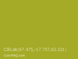 CIELab 67.475,-17.757,62.221 Color is a normal yellow color and the nearest color is Citron #9fa91f. Hex code #a5ab26 and RGB value is rgb(165,171,38). In RGB color space, this color is composed of 65% red, 67% green, 15% blue, In CMYK color space, this color is composed of 4% cyan, 0% magenta, 78% yellow , 33% black , In HSL color space, this color has a hue angle of 63° , 64% saturation and 41% lightness.