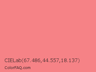 CIELab 67.486,44.557,18.137 Color is a light red color and the nearest color is Light Coral #f08080. Hex code #f68286 and RGB value is rgb(246,130,134). In RGB color space, this color is composed of 96% red, 51% green, 53% blue, In CMYK color space, this color is composed of 0% cyan, 47% magenta, 46% yellow , 4% black , In HSL color space, this color has a hue angle of 358° , 87% saturation and 74% lightness.