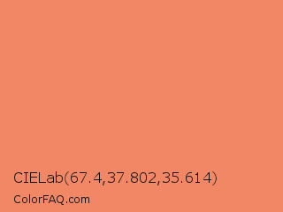 CIELab 67.4,37.802,35.614 Color is a light red color and the nearest color is Salmon #ff8c69. Hex code #f28766 and RGB value is rgb(242,135,102). In RGB color space, this color is composed of 95% red, 53% green, 40% blue, In CMYK color space, this color is composed of 0% cyan, 44% magenta, 58% yellow , 5% black , In HSL color space, this color has a hue angle of 14° , 84% saturation and 67% lightness.