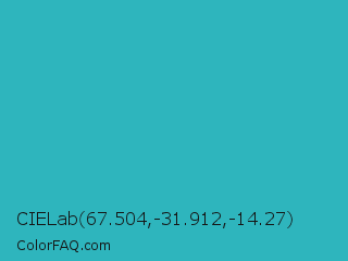 CIELab 67.504,-31.912,-14.27 Color is a normal cyan color and the nearest color is Maximum Blue Green #30bfbf. Hex code #2eb5bd and RGB value is rgb(46,181,189). In RGB color space, this color is composed of 18% red, 71% green, 74% blue, In CMYK color space, this color is composed of 76% cyan, 4% magenta, 0% yellow , 26% black , In HSL color space, this color has a hue angle of 183° , 61% saturation and 46% lightness.