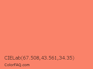 CIELab 67.508,43.561,34.35 Color is a light red color and the nearest color is Coral Reef Hipster Salmon #fd7c6e. Hex code #fa8269 and RGB value is rgb(250,130,105). In RGB color space, this color is composed of 98% red, 51% green, 41% blue, In CMYK color space, this color is composed of 0% cyan, 48% magenta, 58% yellow , 2% black , In HSL color space, this color has a hue angle of 10° , 94% saturation and 70% lightness.