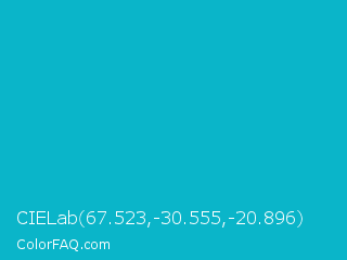 CIELab 67.523,-30.555,-20.896 Color is a normal cyan color and the nearest color is Turquoise Surf #00c5cd. Hex code #0ab5c9 and RGB value is rgb(10,181,201). In RGB color space, this color is composed of 4% red, 71% green, 79% blue, In CMYK color space, this color is composed of 95% cyan, 10% magenta, 0% yellow , 21% black , In HSL color space, this color has a hue angle of 186° , 91% saturation and 41% lightness.